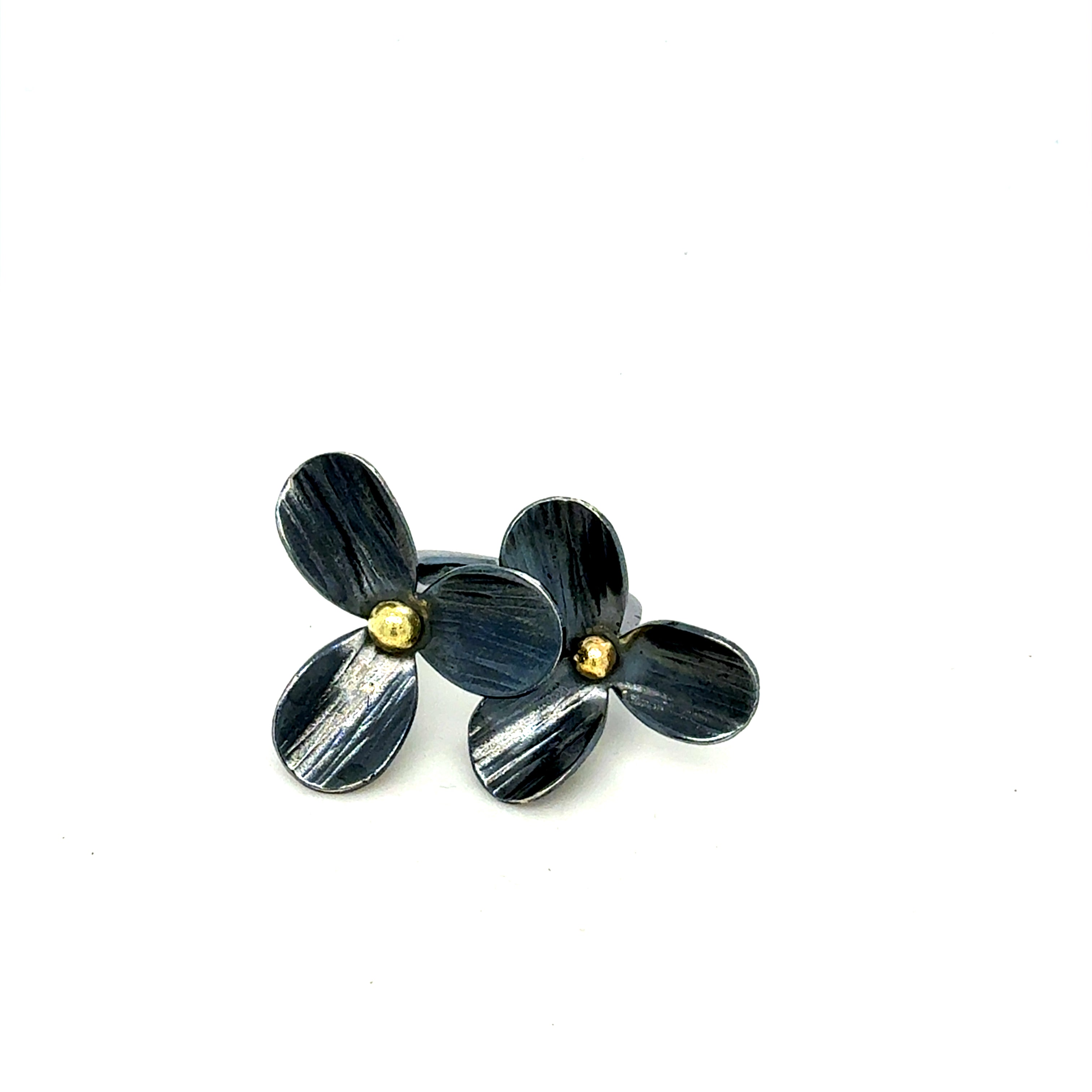 Handcrafted with Black Sterling Silver, the Isabella Nocturna dual ring features two beautifully detailed flowers. Each flower is adorned with 18kt gold spheres, adding a touch of luxury to this elegant and unique piece. This ring is perfect for adding a hint of nature-inspired beauty to any outfit.